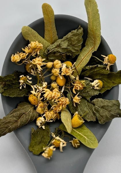 Άνθη και φύλλα φλαμουριάς, φύλλα μελισσόχορτου και άνθη χαμομηλιού.